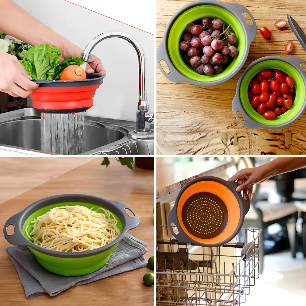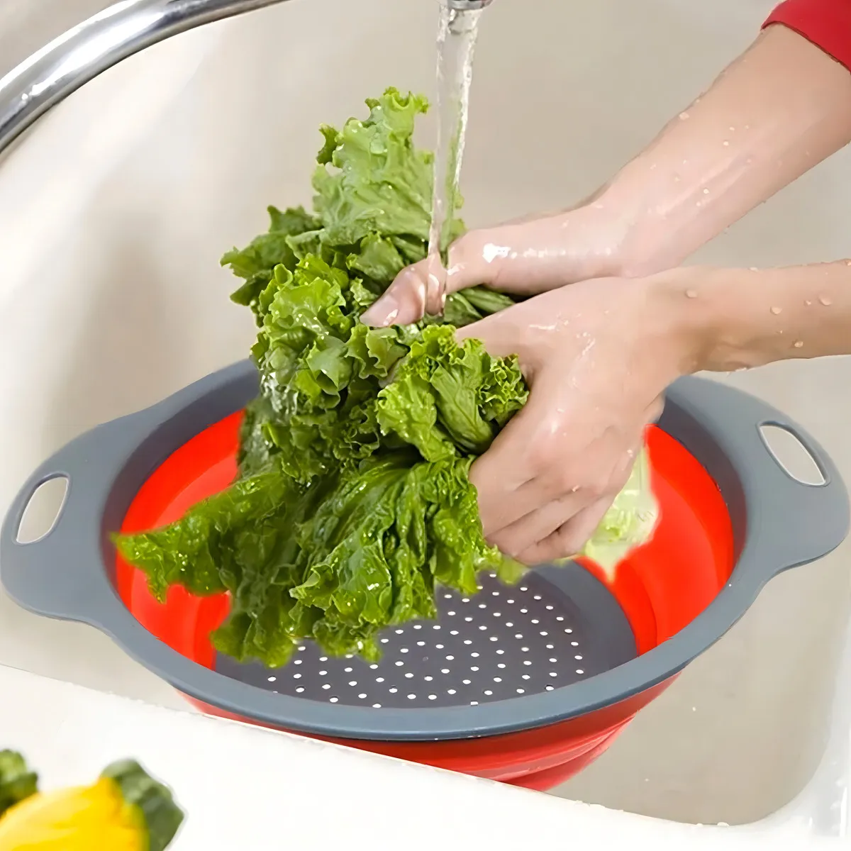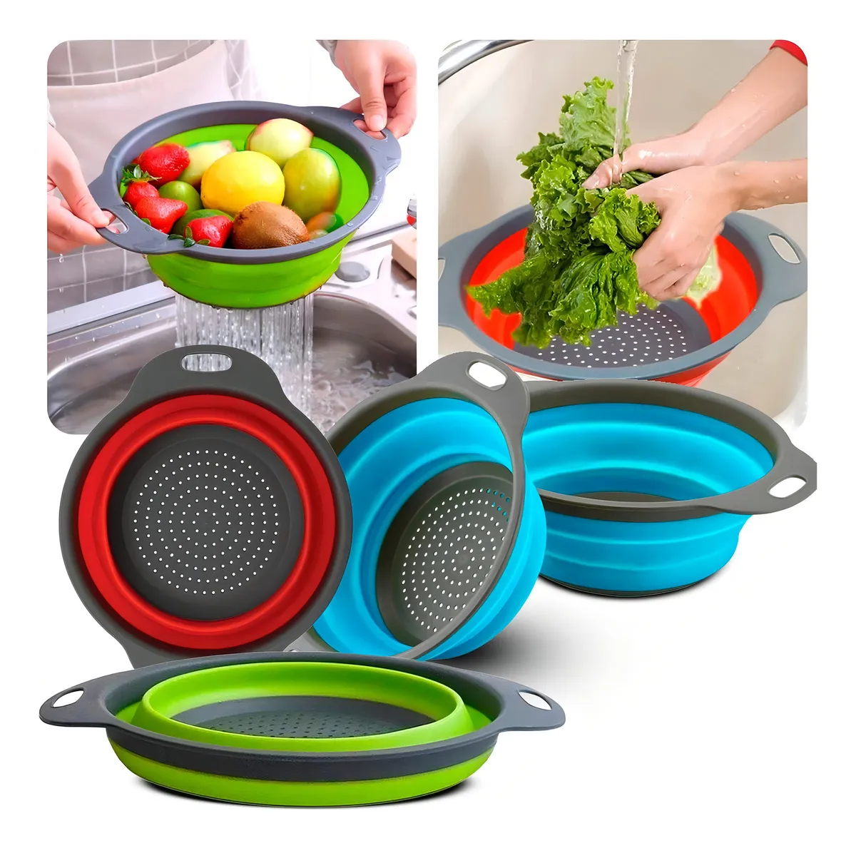 O Escorredor Dobrável de Silicone Multiuso é perfeito para lavar e escorrer frutas, verduras, arroz, macarrão e outros alimentos, trazendo mais praticidade para o dia a dia.