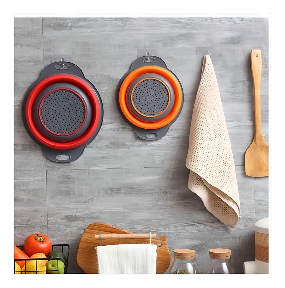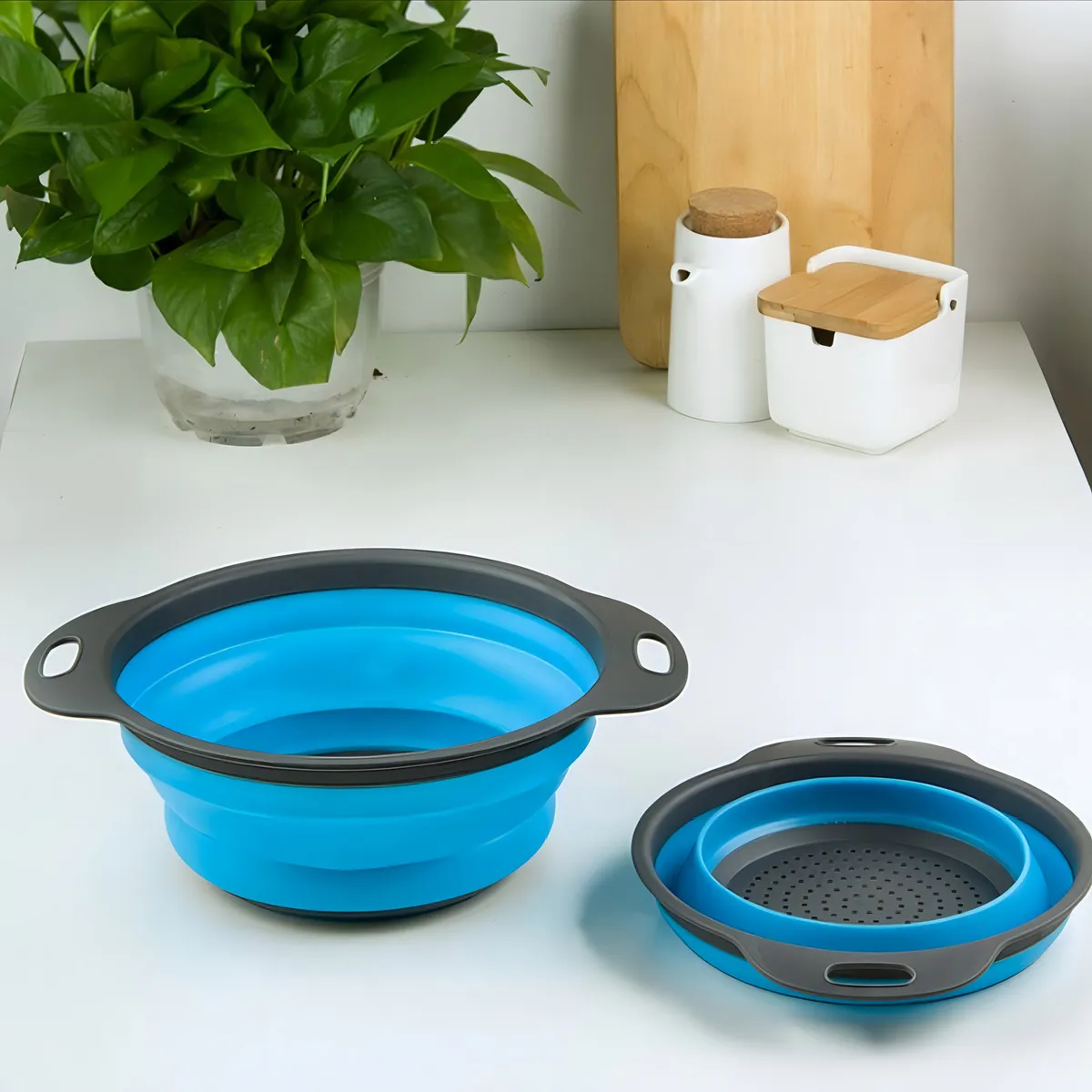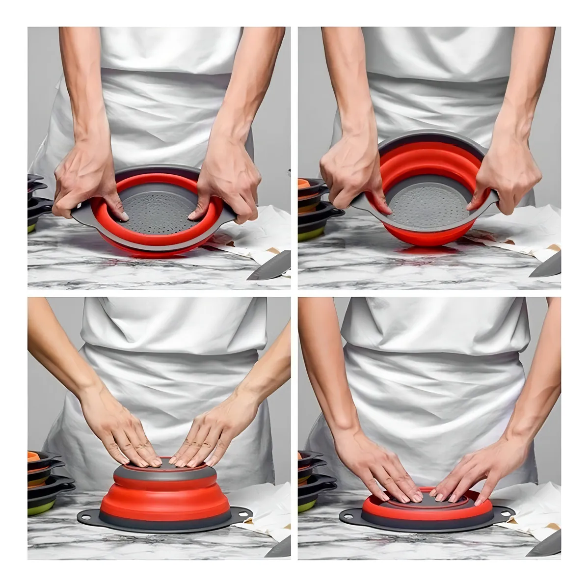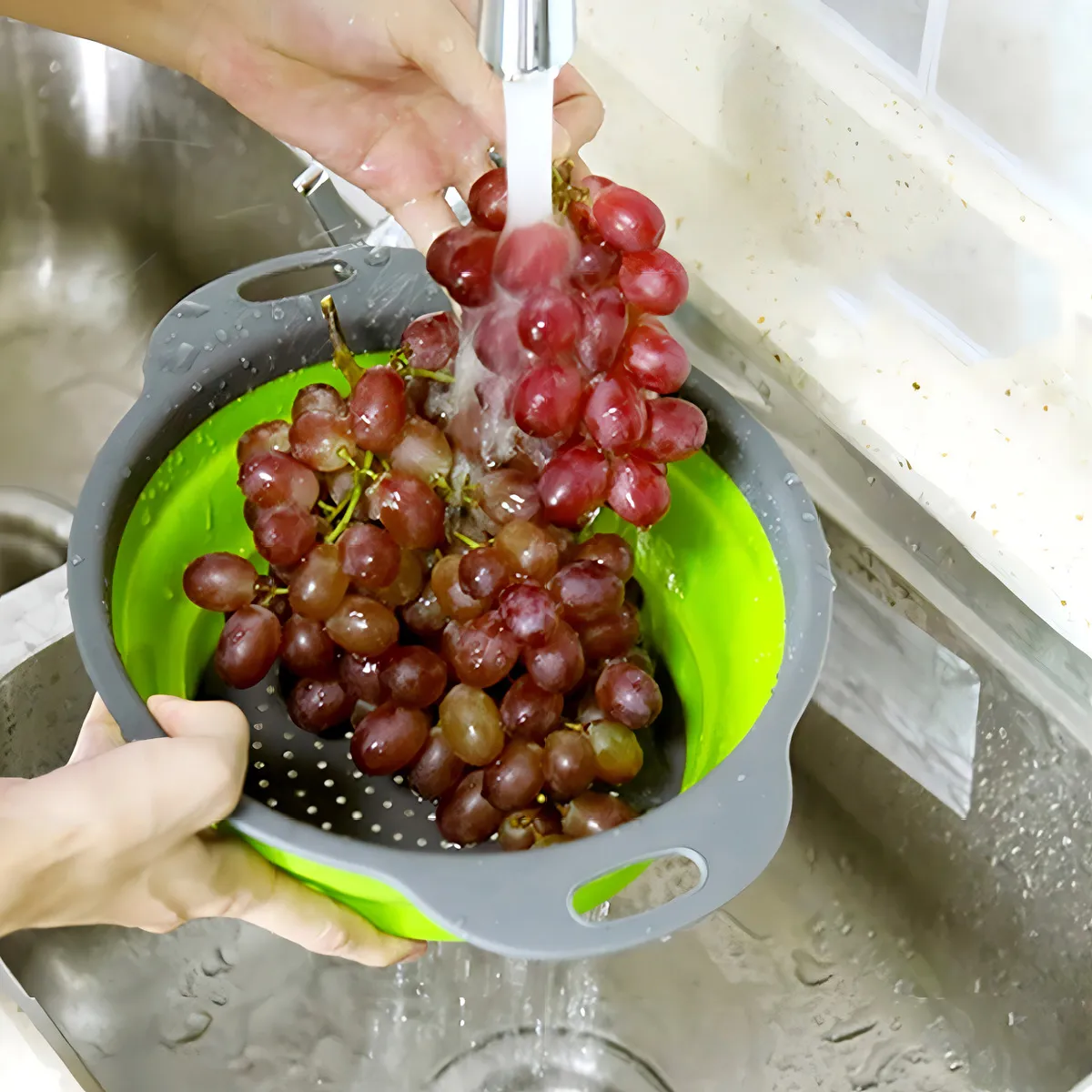 O Escorredor Dobrável de Silicone Multiuso é perfeito para lavar e escorrer frutas, verduras, arroz, macarrão e outros alimentos, trazendo mais praticidade para o dia a dia.