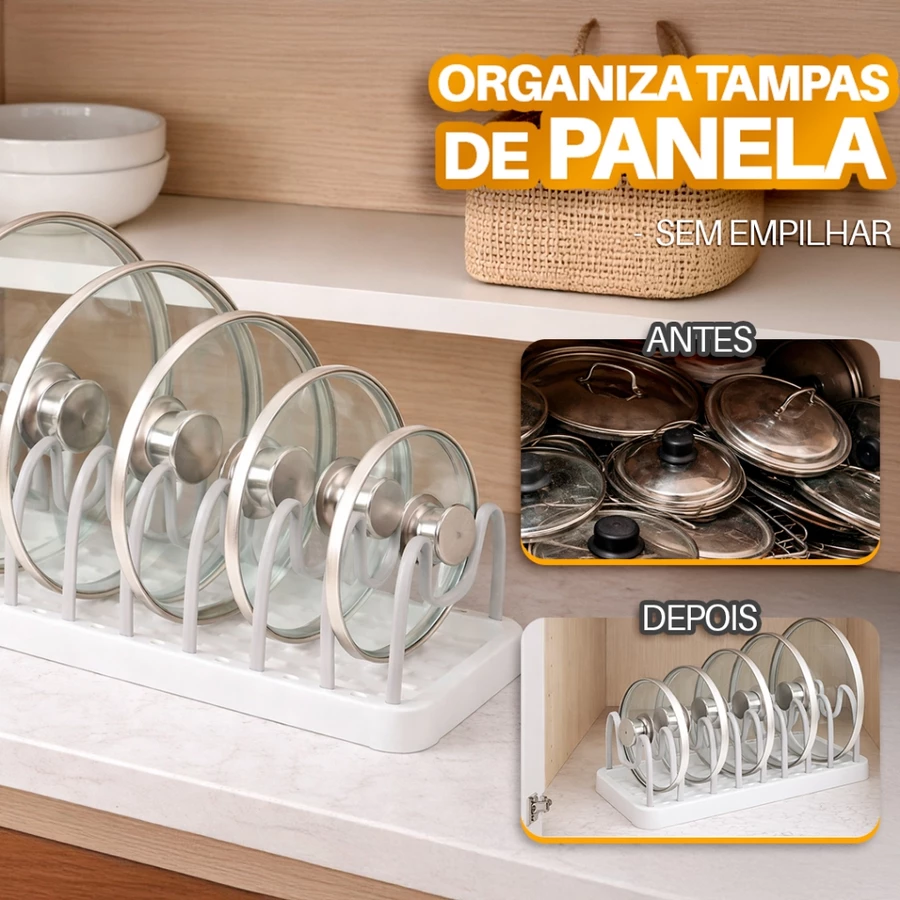 Com ele, você pode armazenar até várias tampas de forma vertical, facilitando o acesso e evitando bagunça na bancada ou dentro do armário.